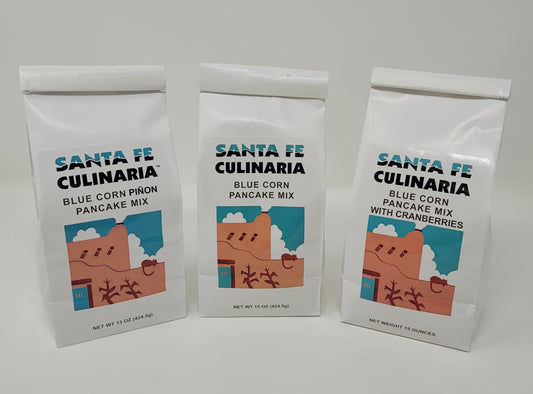 Our original Santa Fe Culinaria Blue Corn Piñon (whole pine nuts) Pancake Mix has been on the market in specialty and gourmet food shops across Northern New Mexico since 1994.